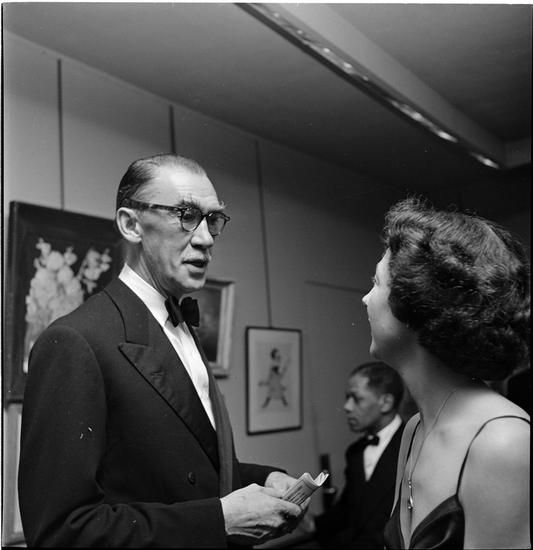 Art by Celebrities Sponsored by the Urban League [Man and a woman talking at the art auction.]