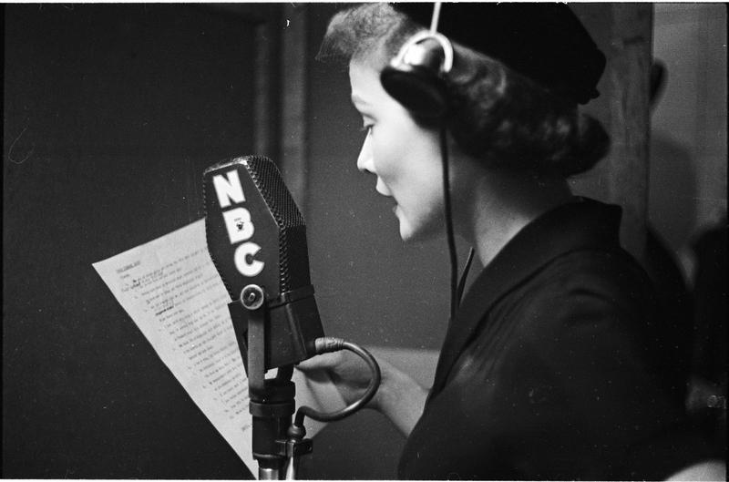 "Quick as a Flash" Radio Show - Aunt Jemima Sponsor [Gene Tierney with a script at a microphone.]