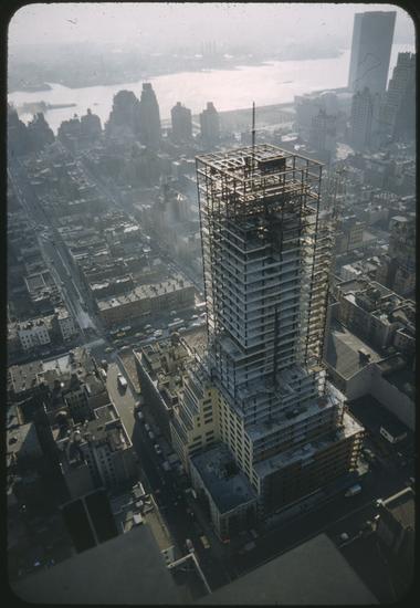 Changing New York [Aerial view looking east showing the General Electirc Building, the Waldorf-Astoria and the Chrysler Building.]