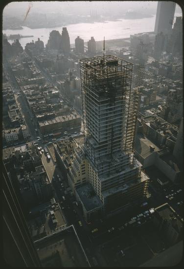 Changing New York [Aerial view looking east showing the General Electirc Building, the Waldorf-Astoria and the Chrysler Building.]