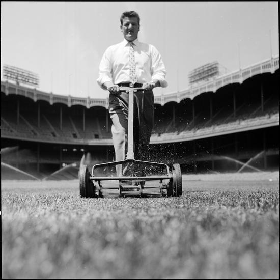 Yankee Stadium [Superintendent Jim Thompson pruning the grass on the baseball field.]