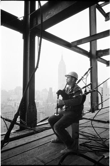 Changing New York [Construction worker playing a bagpipe and sitting on scaffolding.]