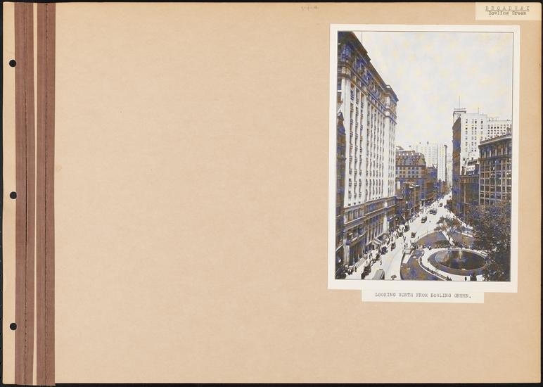 Description Looking north from Bowling Green. | J. Clarence Davies Street Views Scrapbook.