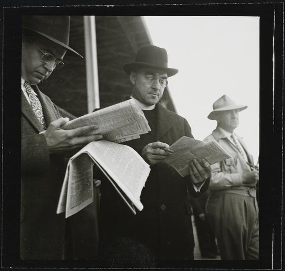 Aqueduct Race Track [Men reading newspapers and racing forms.]