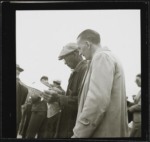 Aqueduct Race Track [Men reading newspapers at a racetrack.]
