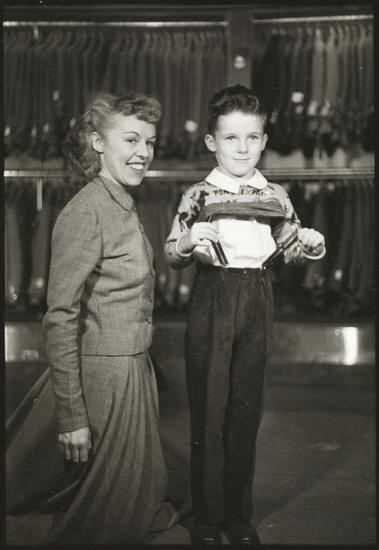 Bumper Baby Crop Now Gets Its First School Clothes [Boy modeling an outfit in a clothing store.]