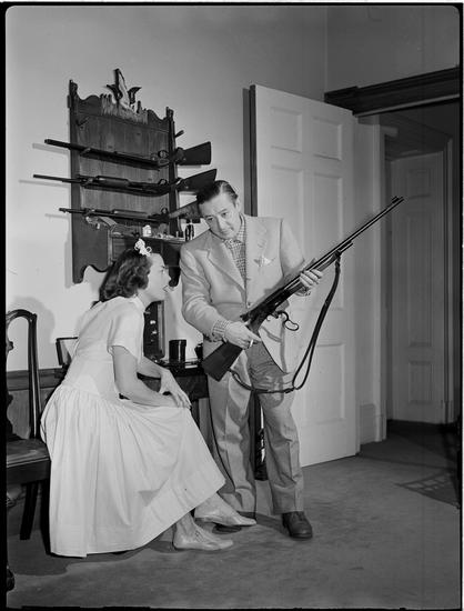 Billy Rose [Billy Rose and Eleanor Holm sitting on a couch in front of a gun rack.]