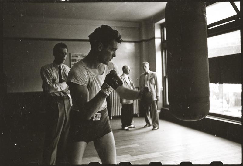 Walter Cartier, Prizefighter of Greenwich Village [Walter Cartier hitting a punching bag as men watch.]