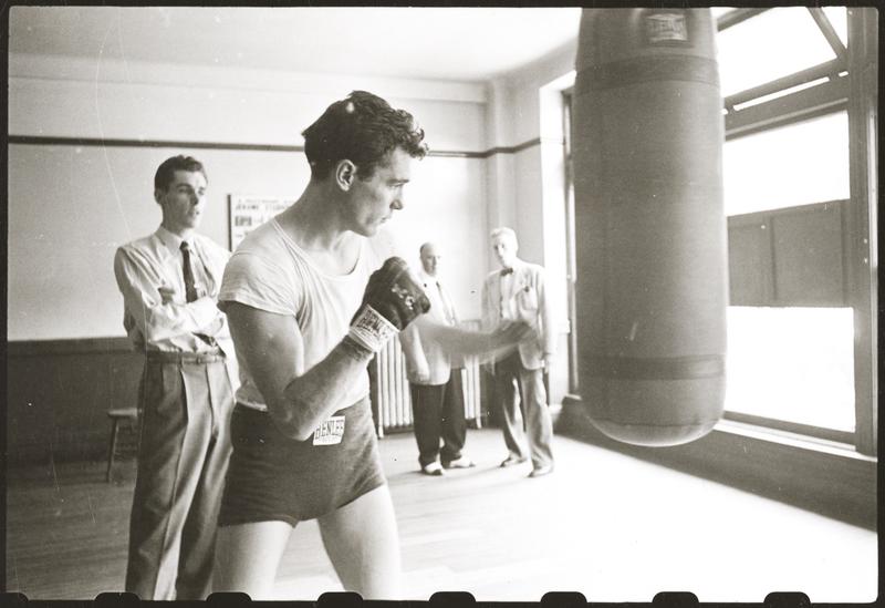 Walter Cartier, Prizefighter of Greenwich Village [Walter Cartier hitting a punching bag as men watch.]