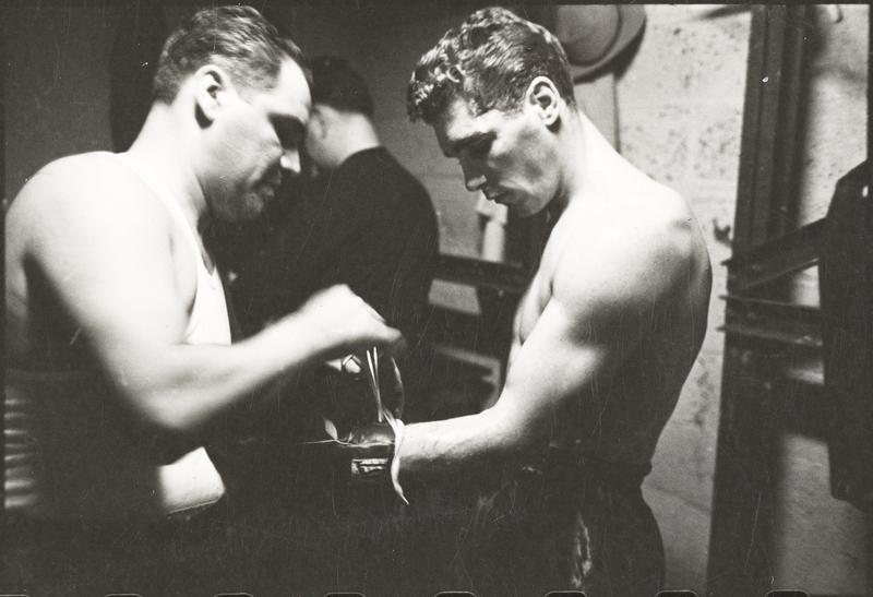 Walter Cartier, Prizefighter of Greenwich Village [Vincent Cartier helping Walter Cartier take his boxing gloves off.]