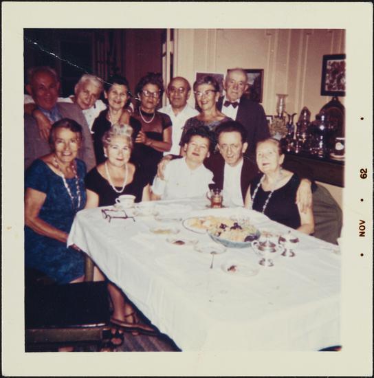[Solomon Shapiro surrounded by his friends at a dinner party.]