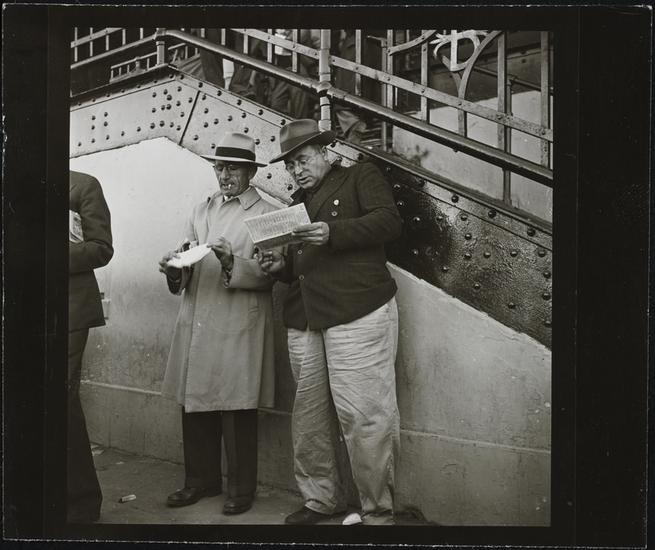 Aqueduct Race Track [Men reading newspapers at a racetrack.]