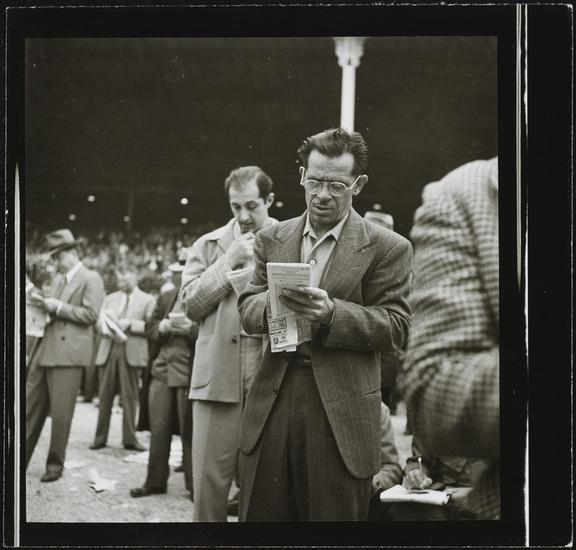 Aqueduct Race Track [Men with newspapers and racing forms at a racetrack.]