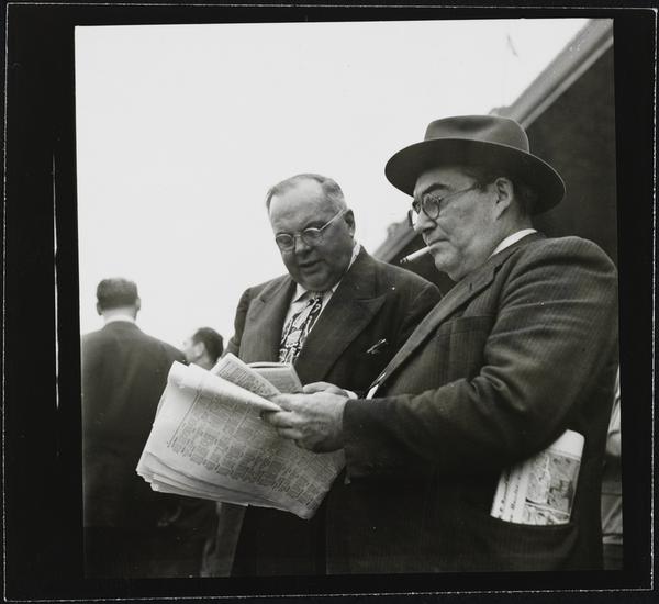 Aqueduct Race Track [Two men reading a newspaper at a racetrack.]