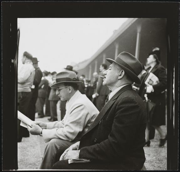 Aqueduct Race Track [Two men with cigars, reading newspapers, at a racetrack.]