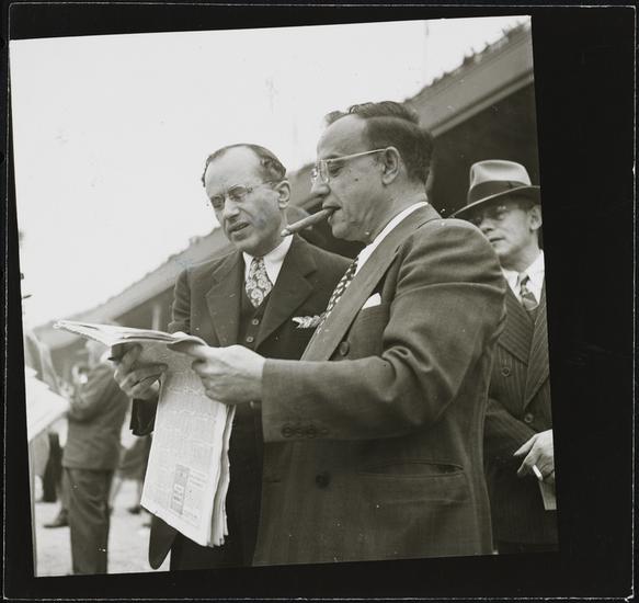 Aqueduct Race Track [Two men with cigars, reading newspapers, at a racetrack.]