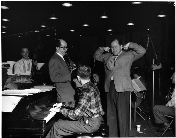 [Ted "Sport" Morgan and Phil Silvers at a recording session for "Top Banana".]