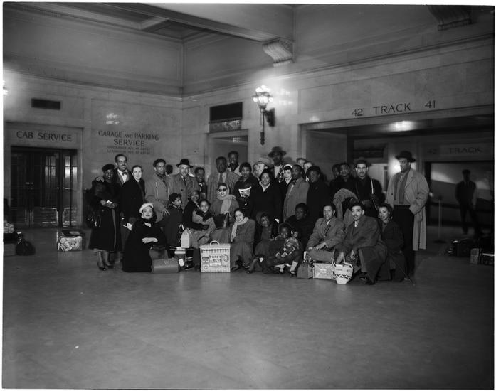 [Cast and crew of "Porgy and Bess" in Grand Central Terminal.]