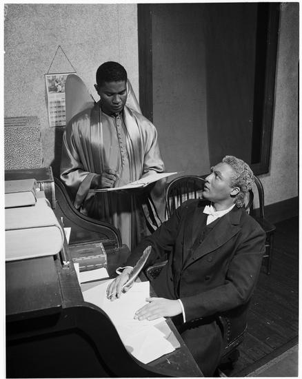 [William Marshall and another actor on the set of "The Green Pastures".]