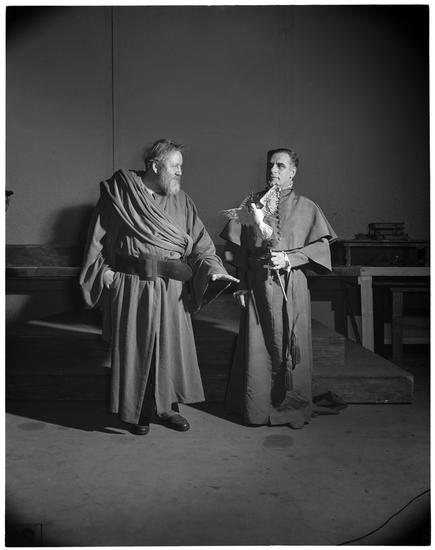 [Charles Laughton as the title role and Michael Citro as either a singer or Andrea in "Galileo".]