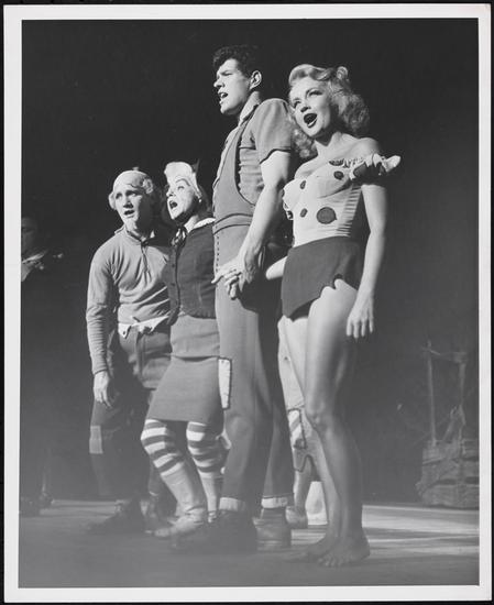 [Joe E. Marks as Pappy Yokum, Peter Palmer in the title role and Charlotte Rae as Mammy Yokum in "Li'l Abner".]