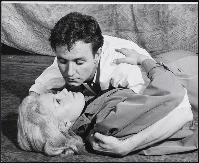 [Kenneth Haigh as Jimmy Porter and Mary Ure as Alison Porter in "Look Back in Anger".]