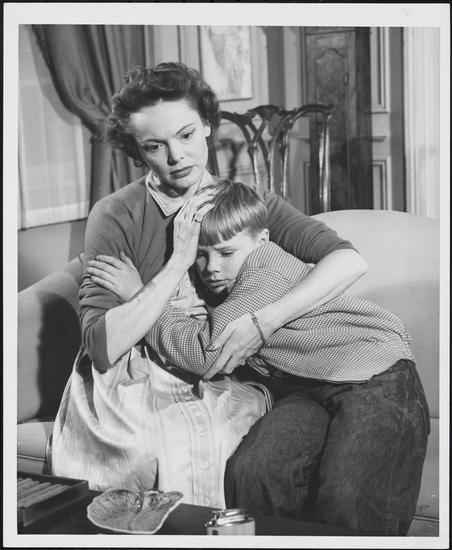 [Nancy Coleman as Eleanor Hillard, Malcolm Brodrick as Ralphie Hillard and Paul Newman as Glenn Griffin "The Desperate Hours".]