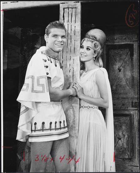 [Brian Davies as Hero and Preshy Marker as Philia in "A Funny Thing Happened on the Way to the Forum".]
