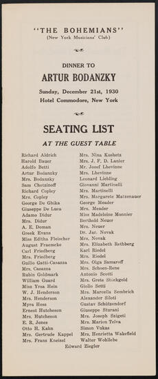 "The Bohemians" (New York Musicians' Club) Dinner to the Flonzaley Quartet. Seating List at the Guest Table