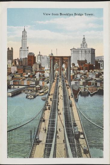Woolworth and Municipal Buildings, from Brooklyn Bridge, New York.