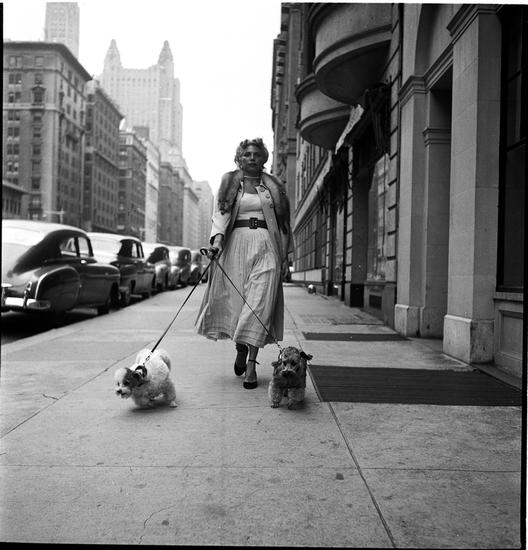 A Dog's Life in the Big City [Woman walking two dogs.]