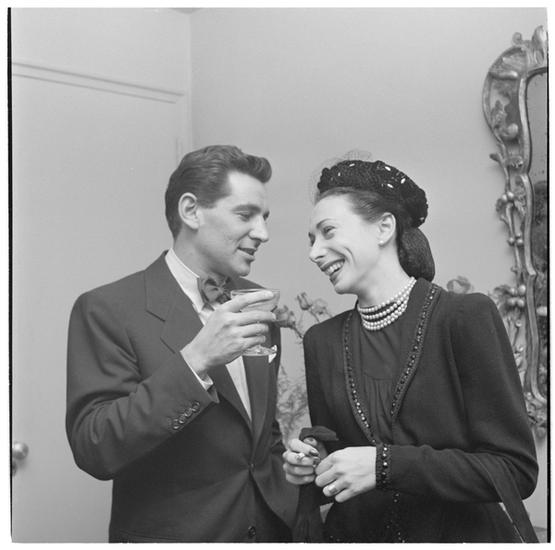 Leonard Bernstein [Leonard Bernstein talking to a woman at a party.]