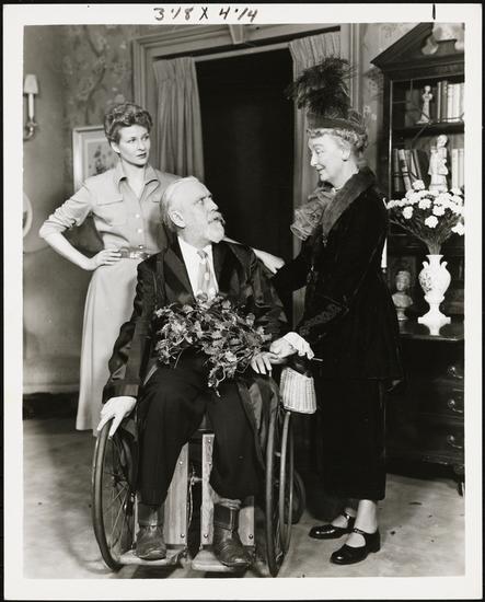 [Monty Woolley as Sheridan Whiteside, Claudia Morgan as Maggie Cutler and Muriel Hutchison as Lorraine Sheldon in "The Man Who Came to Dinner".]