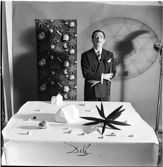 Salvador Dali: Rugs [Salvador Dali standing in front of a rug he designed near a table with objects.]