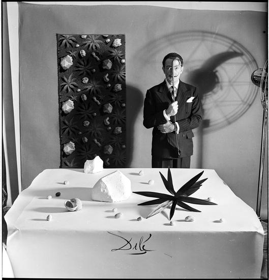 Salvador Dali: Rugs [Salvador Dali standing in front of a rug he designed near a table with objects.]