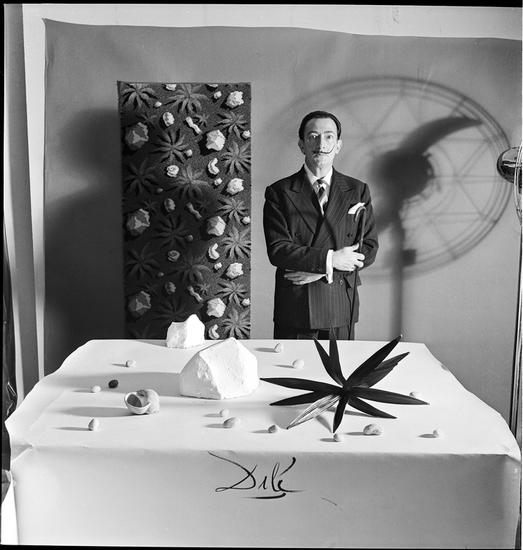 Salvador Dali: Rugs [Salvador Dali standing in front of a rug he designed near a table with objects.]