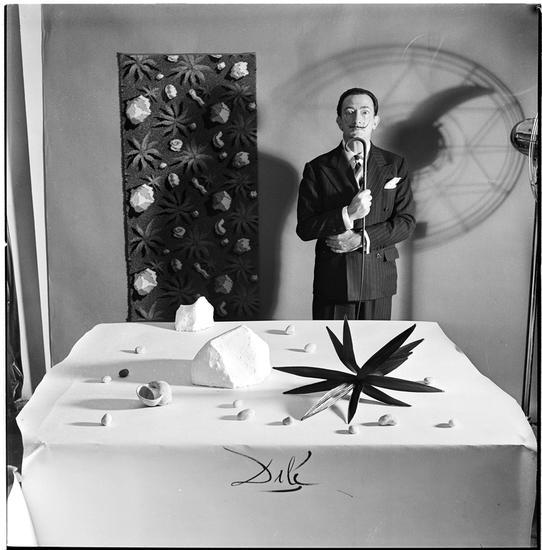 Salvador Dali: Rugs [Salvador Dali standing in front of a rug he designed near a table with objects.]