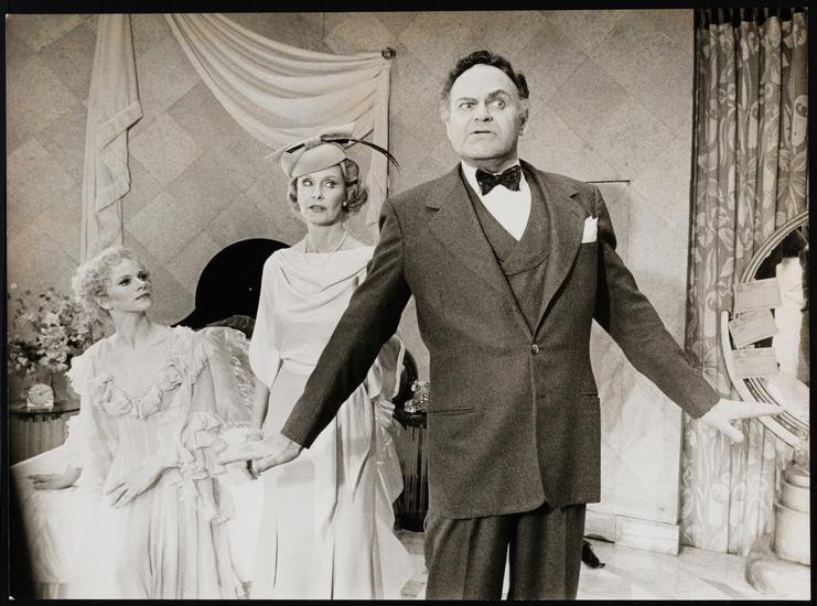 [Galina Panova as Vera Barnova, Dina Merrill as Peggy Porterfield and George S. Irving as Sergei Alexandrovitch in "On Your Toes".]