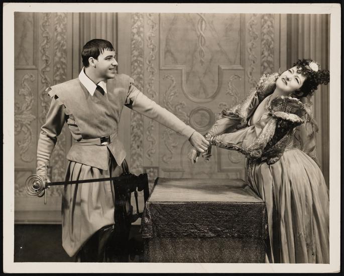 [Lynn Fontanne as Katharina and Alfred Lunt as Petruchio in "The Taming of the Shrew".]