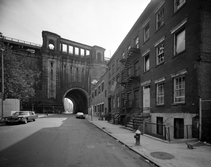 [Manhattan Bridge overpass and surrounding neighborhood.]