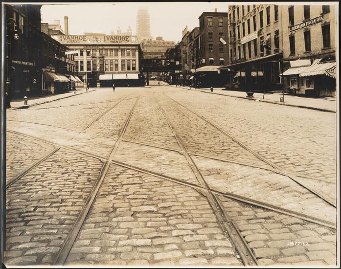 [Fulton and Water Streets, looking toward South Street Seaport Historic District.]