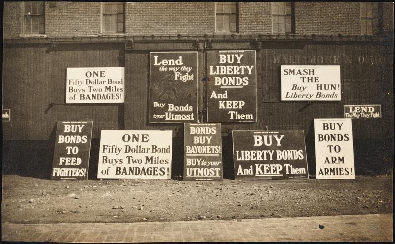 Street Scenes, etc. Showing Displays of Liberty Loan Posters during World War I [Liberty Loan signs on a building.]