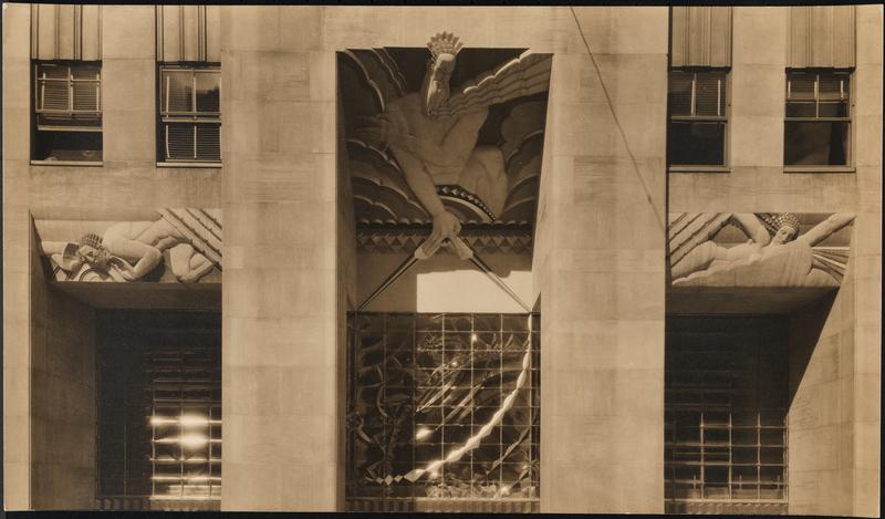["Genius Seizing the Light of the Sun" and "The Conquest of Space" limestone panels by Gaston Lachaise on the entrance pier to the RCA Building West.]