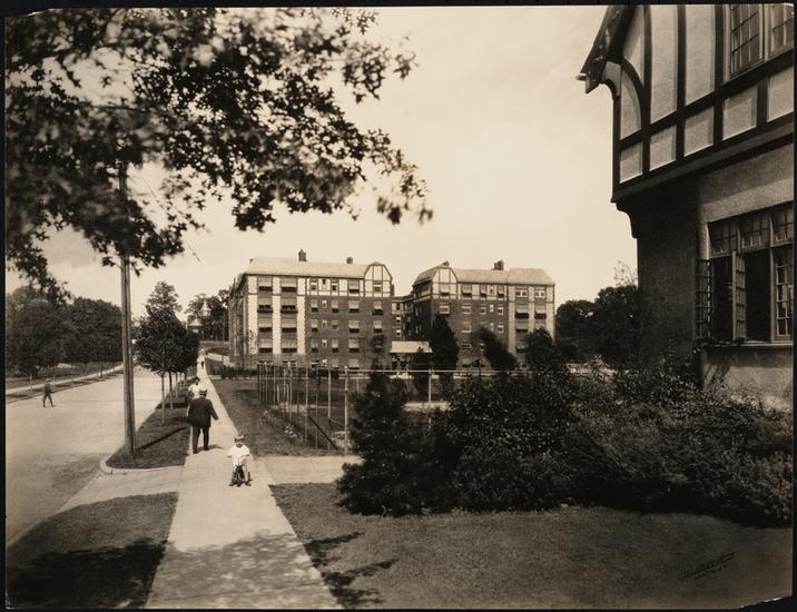 Jackson Heights Apartments. Rear of buildings with two men and child