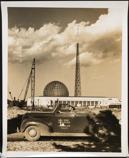 [Construction of the Trylon and Perisphere at the New York World's Fair site.]