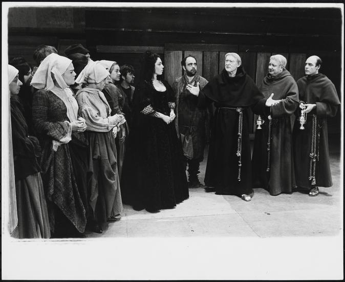 [Albert Dekker as Father Barre with others in "The Devils".]