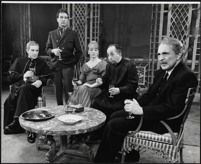 [Olive Deering as The Contessa, Leo Genn as Monsignor Blaise Meredith and Sam Levene as Dr. Aldo Meyer in "The Devil's Advocate".]