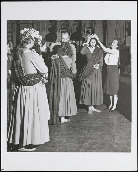 [Mollie Smith as Jean MacLaren with dancers in "Brigadoon".]