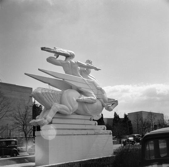 ["Speed" statue in front of the Communication Building, New York World's Fair.]