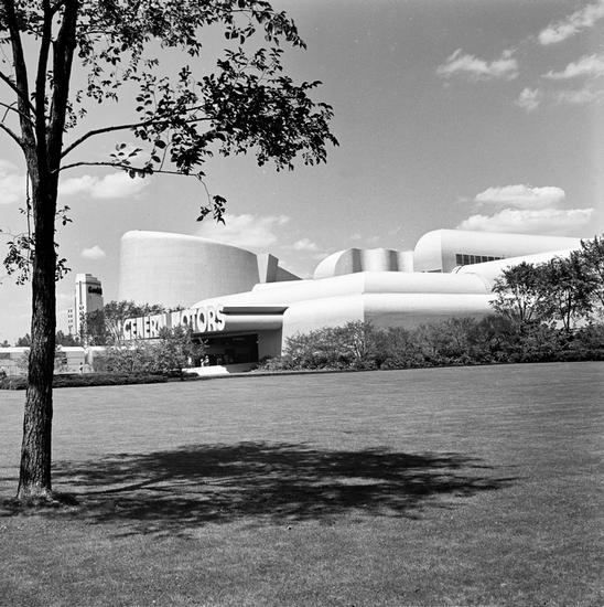 [General Motors building at New York World's Fair, with people waiting in line for the Futurama ride.]